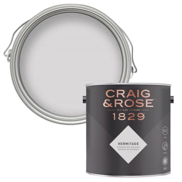 A muted but warm putty grey, Hermitage is an impactful and versatile shade adds nuance and atmosphere to a room. Use with 1829 White Undercoat.