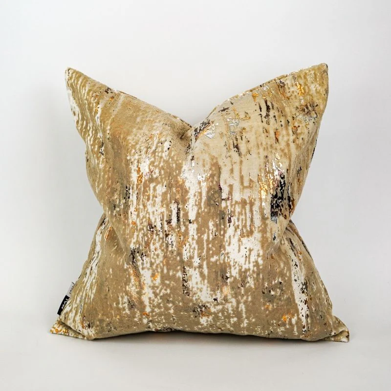 The Malini Torcello Gold Metallic Cushion is a striking addition to your decor, featuring a cream base with mesmerising gold metallic flakes. Its unique cracked design adds texture and depth, making it a standout sofa cushion or bedroom cushion.