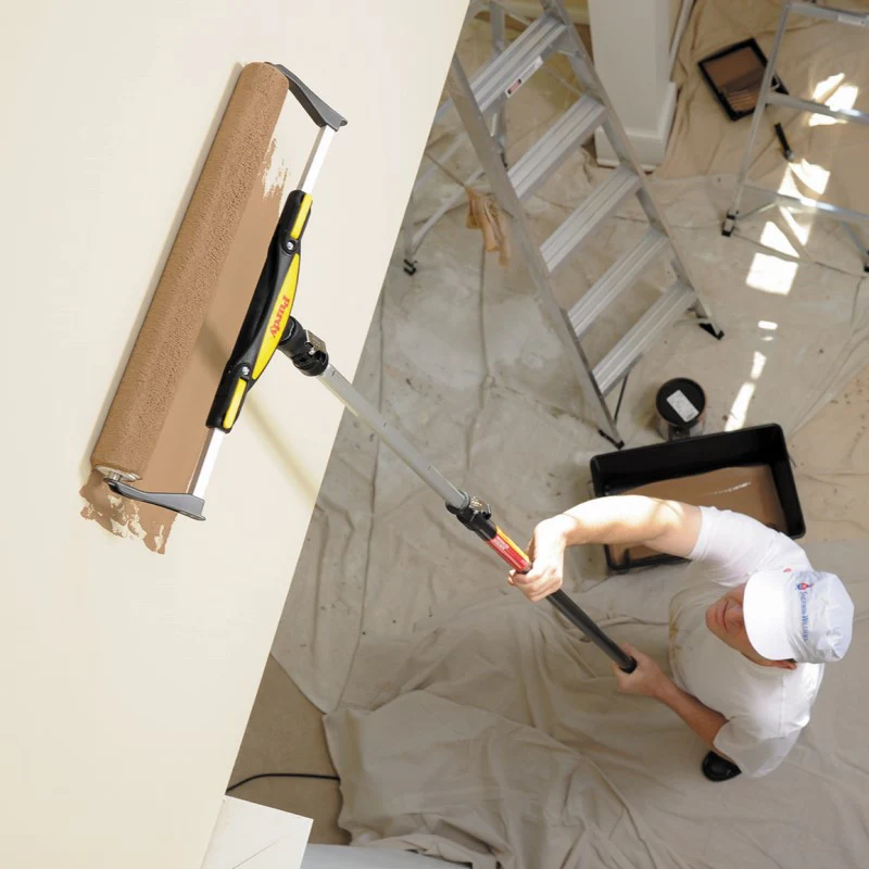 The Purdy Premium Adjustable Roller Frame is a professional-grade Purdy roller frame designed for painting large surfaces with efficiency. Made from lightweight aluminium and durable nylon, this adjustable paint roller frame features a unique locking mechanism for quick adjustments and an angled design that provides greater coverage with less effort.